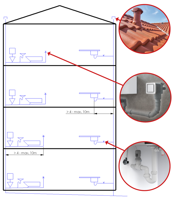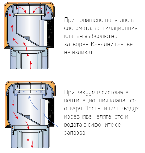 • Въздушниците монтирани директно върху хоризонталните канализационни отклонения предотвратяват изсмукването на водата в отводнителните точки и по този начин се спират неприятните миризми