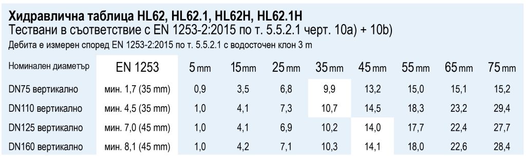 Водоприемник е избран в съответствие с EN 1253, където за отводни тръби DN75 и DN110 се взема предвид стойността с височина на подприщване от 35 mm. За отводни тръби DN125 и DN160 се използва стойността с височина на подприщване от 45 мм.