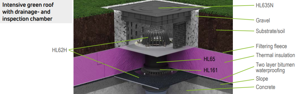 Careful planning is essential to prevent damage to the roof or building in the first place. The use of the right products for the respective application also plays a key role in the realisation of green roofs. Drainage is essential. The subsequent maintenance of the green roof should already be taken into account when planning the roof drainage. It is therefore essential to plan an inspection chamber for roof drains on green roofs. This makes maintenance much easier later on. For this reason, HL has developed the HL635N inspection and drainage shaft, which is ideal for green, gravel and patio roofs.