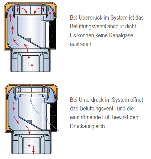 - Die Rohbelüfter direkt an den horizontalen Anschlussleitungen sollen verhindern, dass die Gerüchsverschlüsse an den Ablaufstellen leergesaugt werden und somit ebenfalls Geruchsbelästigung verhindern