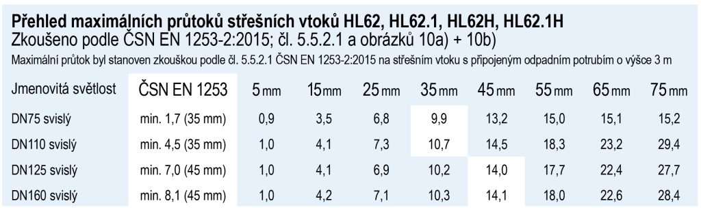 Podľa normy EN1253-2 sú výrobcovia strešných a parapetných vpustov povinní uviesť hodnoty odvodňovania v tabuľke alebo diagrame ako funkciu hladiny vody nad tesniacou prírubou.