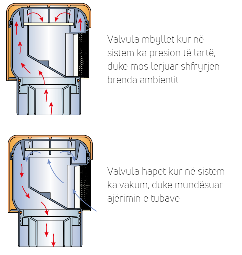 - Valvulat e ajërimit që lidhen me tubat horizontal duhet të parandalojnë thithjen e ujit nga sifonat në pileta dhe të shmangin erën e keqe