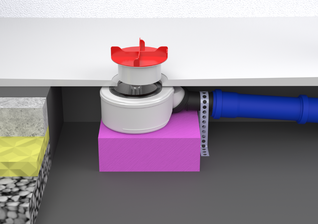 Pasi vulosja të përfundojë, pjata e dushit ngjitet mbi shtresën e varfër ose mbi hidroizolimin. Këtu lind sfida e dytë, sepse me një sifon konvencional, puna duhet të kryhet me përpikëri milimetrike që hapja e pjates të vendoset drejtpërdrejt mbi hapjen e sifonit. Nëse hapja nuk është e pozicionuar mbi sifonin (shih Figurën 8) dhe ka një zhvendosje, pjata e dushit nuk mund të bashkohet siç duhet me sifonin.