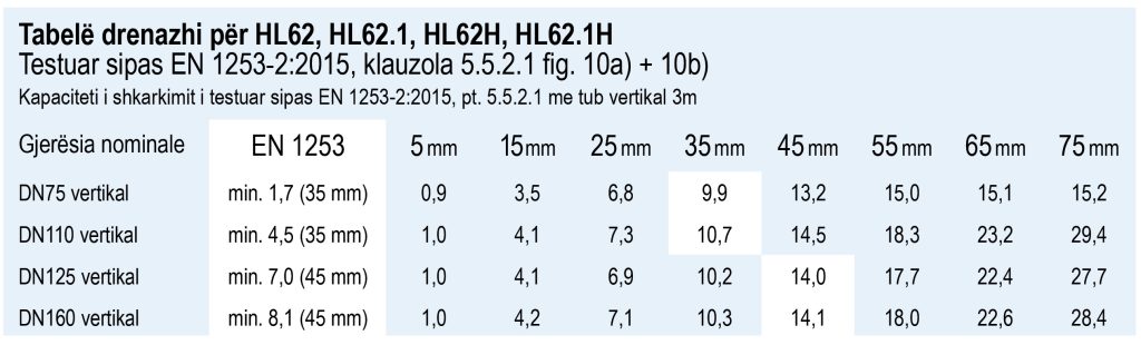 Dimensioni i daljes së kulmit zgjidhet në përputhje me EN 1253, ku për dimensionet DN75 dhe DN110 merret parasysh vlera me thellësi uji 35 mm. Ndërsa për dimensionet DN125 dhe DN160 përdoret vlera me thellësi uji 45 mm.