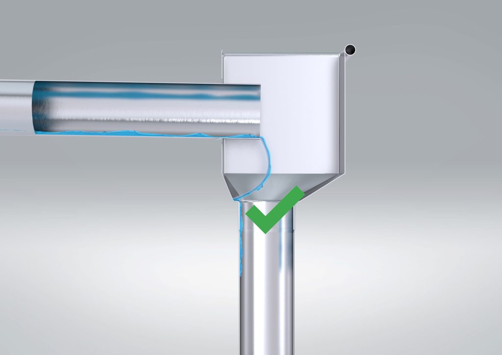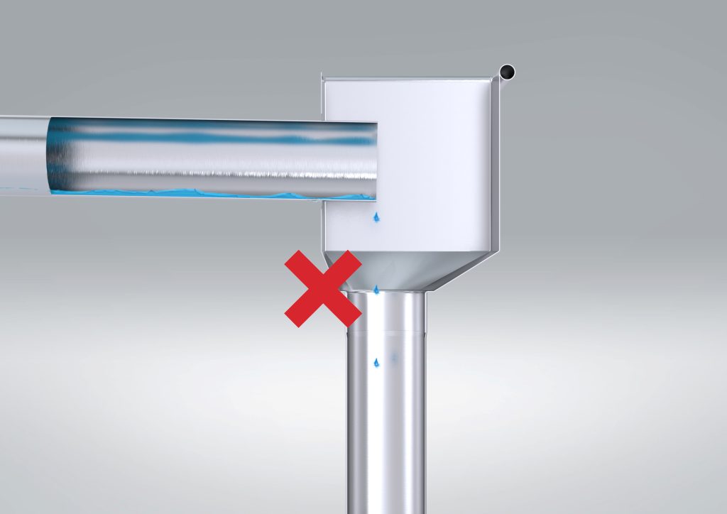 Për të parandaluar ndarjen e pikave në dalje të tubit, pikat e shiut duhet të drejtohen drejt murit të brendshëm të kutisë mbledhëse ose të tubit vertikal, në mënyrë që të mos ndahen dhe bien, por të rrjedhin përgjatë murit të brendshëm. Një shirit llamarine që lidh të dy komponentët mund t’i drejtojë pikat në vendin e dëshiruar. Pasi pikat të jenë drejtuar drejt murit të brendshëm, forcat kohezive parandalojnë që ato të ndahen përsëri, duke lejuar që të rrjedhin pa ndërprerje përgjatë murit të brendshëm të tubit vertikal.