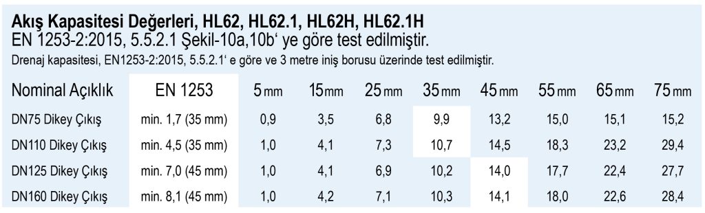 EN1253-2’ye göre çatı ve çatı arası süzgeç üreticileri, sızdırmazlık flanşının üzerindeki yüksekliğe bağlı olarak gider değerlerini bir tablo veya diyagramda göstermek zorundadır.
