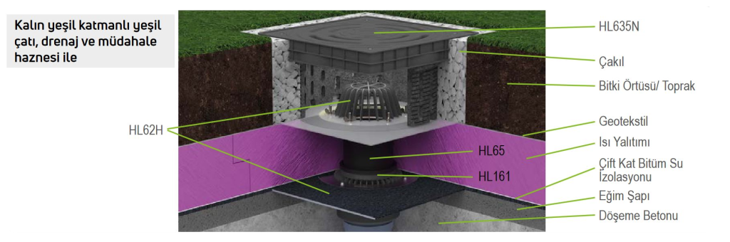 İlk etapta çatıya ve yapıya zarar gelmesini önlemek için doğru ürün ve detayla çalışmak gerekecektir. Yeşil çatılarda drenaj önemli rol oynamaktadır. Çatıyı planlarken ileride gerçekleşmesi beklenen bakım ve onarım işlemleri de göz önünde tutulmalıdır. Bu nedenle drenaj sistemlerine bakım, gözlem ve müdahale için gerekli olacak ürün HL635N bakım ve müdahale haznesi olacaktır. Yeşil katman yüksekliğine göre, yükseklik ayarı yapılabilen, HL636N yükseltme parçası da istenmesi durumunda kullanılabilir.